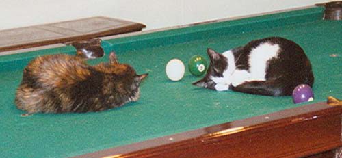 At Christmas time, the tree in the lobby was fair game. Many was the ornament that met its demise at his paws by being batted off the tree, then around the lobby and hallways until it would break. His antics were never frowned upon by the administration as the residents took great joy in watching his escapades. He would often get on the desks, and promptly scatter paperwork and decorations all over the room. Many was the time that after this exhausting activity he could be found curled up, sleeping with his sister on the pool table.
