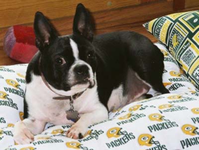 We adopted Packer on Sunday, January 4, 2004. I was working at The Humane Society of the United States regional office in Naperville, Illinois, on Friday, January 2nd. I was the only person in the office that day when a person from A.D.O.P.T., one of the local animal shelters, came in to pick up some of our brochures that we distributed to local organizations. (A.D.O.P.T. is an excellent shelter, and we subsequently adopted three more dogs from them, our Chinese Crested Yogi and and two more Bostons, Lambeau and Cagney.) The A.D.O.P.T. volunteer saw the pictures of our Boston Terriers on my desk and said, "We've got one of those at the shelter." Of course, that excited me, so I called my husband Jeff at his work and said meet me at the shelter during lunch. We met there and saw the Boston that was, at that time, named Simon. We had lost one of our Bostons, Pepsi, in 2001 to a brain tumor after a long illness and treatment period and had hesitated about getting another dog. We still had two Bostons, Pluto and Pogo, but we decided it was time to add another one and we wanted Simon; however, we needed to bring our dogs to meet him before we made the final commitment. Jeff had to work Saturday, so we took Pluto and Pogo to the shelter on Sunday and adopted Simon, who was just a puppy at eight months old. We changed his name to Packer for the Green Bay Packers.
