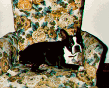 When Penguin turned ten years old, I decided that I needed another Boston Terrier, and we got Pepsi. Penguin was so terribly upset that it took more than a month before he would even tolerate the new dog. One Sunday we were watching a movie on the VCR, Penguin in my lap, and Pepsi slyly sidled up to me and hopped up on the other side. By the time the movie ended, Penguin and Pepsi each had his head on my lap, noses touching, and after that they became great pals. However, the age difference was apparent, since Pepsi would want to play and play long after Penguin was tired of the game and fed up with Pepsi.