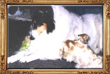 Lacey was 13 years old when we put her to sleep due to arthritis and losing control of her organs. She was my best friend and such a wonderful dog. She is the white dog looking at the green bird. She was a rare white collie. Lacey's favorite thing to do during the day and night, was sleeping - but every now and then she would get up and play. Lacey lived a long and happy life and she will be missed very much by me and my family. She is the best dog I ever had and even if I do get another dog, no other dog will even come close to replacing her. I love you Lacey.